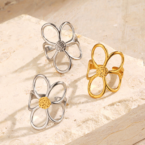 Anello elegante in acciaio inossidabile con anello regolabile con fiore cavo in acciaio inossidabile
