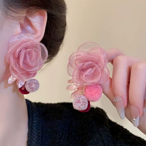 Lưới ngọc trai nhựa vải hoa bạc kim Bông Tai cô gái ngọt ngào Thu Hải Đường Hoa tóc Bóng Bông tai thời trang đa năng bông tai